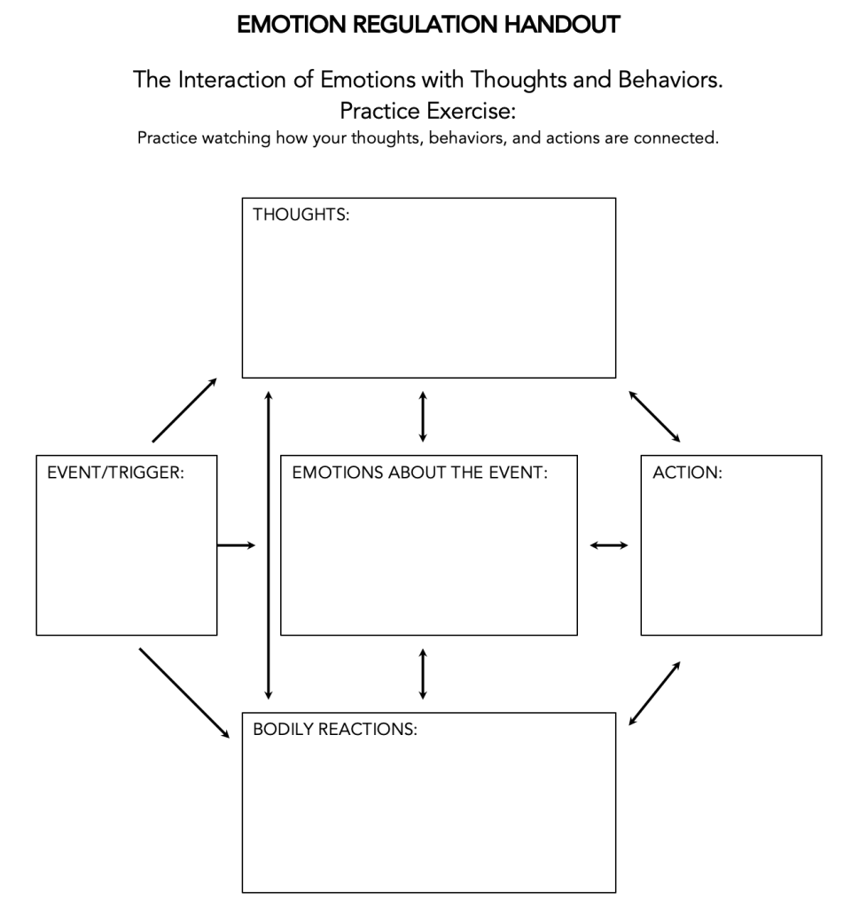 The above is the Anatomy of the Emotion. When emotions happen there are many things that happen all at once, so breaking it down helps to understand where we can control ourselves and interweave skills to help our outcome be something that fits our values and not engage in maladaptive behaviors.