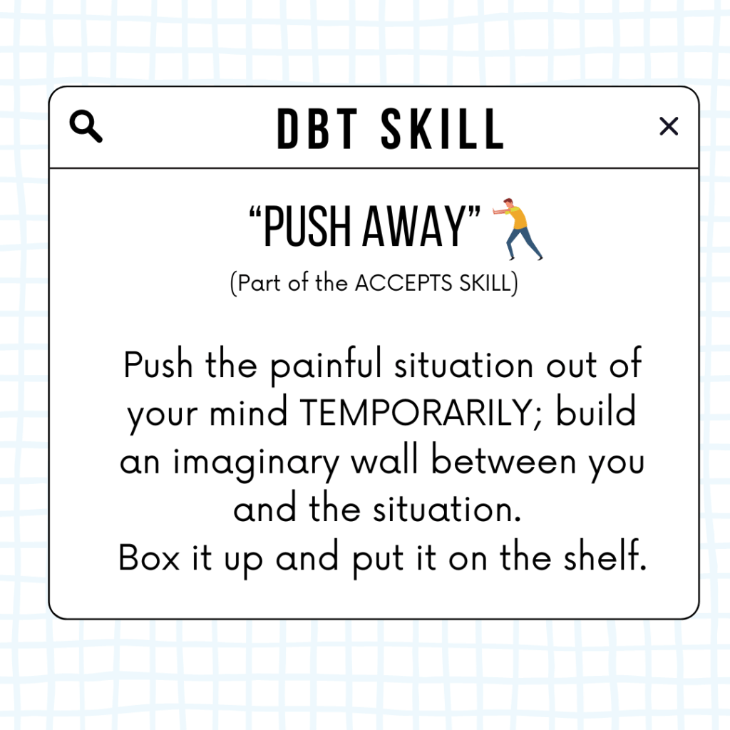 Have you heard of the Push Away Skill? It’s part of the ACCEPTS SKILL that is under DISTRESS TOLERANCE SKILLS .