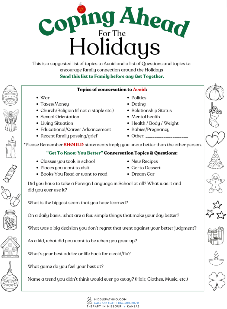 Are you ready for the Holiday Season? That time when you are around family or close friends and you just not sure what to discuss? This is a fun worksheet you can send ahead to your family to use to help set some simple boundaries for your loved ones to Avoid and some interesting questions and topics to help grow relationships.