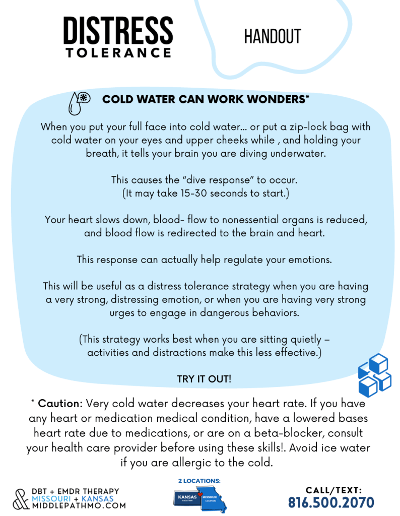 When we’re emotionally dysregulated—angry, panicked, dissociated, or on the verge of engaging in unsafe behaviors—our nervous system is in overdrive. The cold water skill disrupts that pattern quickly and physiologically.