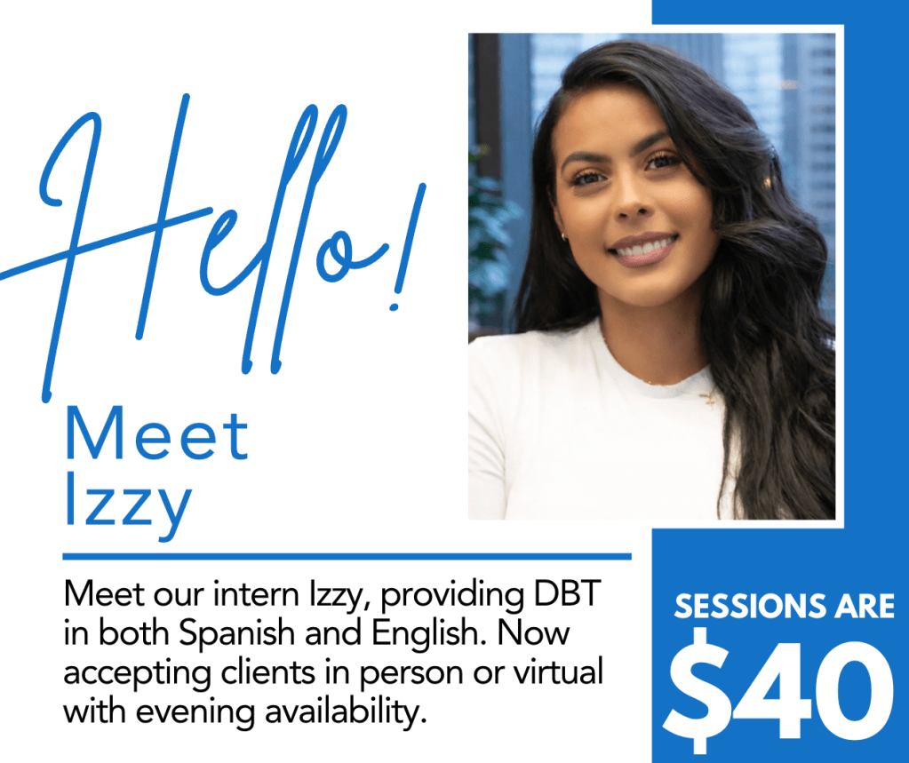 We are so lucky to have Izzy’s talent on our team, and her schedule is already beginning to fill up. If you’ve been waiting for the right time to start therapy—or if you’ve been looking for an affordable, bilingual, and skills-focused therapist—now is the time!