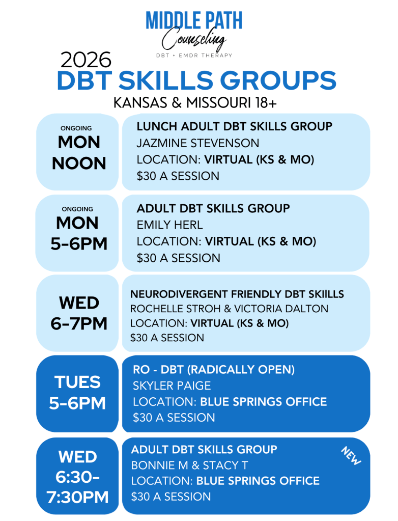 At Middle Path Counseling MO/KS, we believe in the dialectic: you are doing the best you can AND you can learn to do better. Our groups are affordable ($30/session) and led by compassionate, licensed professionals.