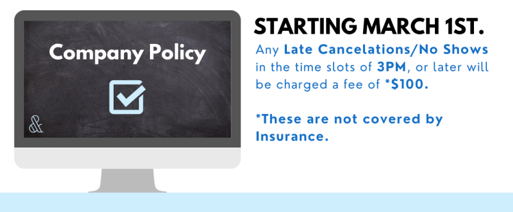 - If you do not show up for your scheduled therapy appointment, and you have not notified us at least 24 hours in advance, you will be required to pay $75 that will be collected that day.